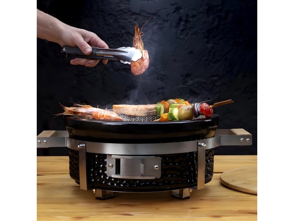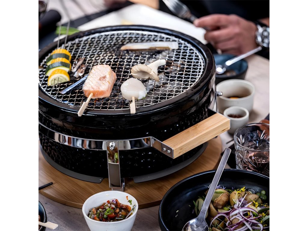 Hibachi keramický gril – tisíciletá tradice keramiky pro dokonalé grilování Náš prémiový keramický gril je nejlepší volbou pro venkovní faszénové grilování Robustní konstrukce z nerezové oceli, bambusu a keramiky; kompaktní a přenosný design