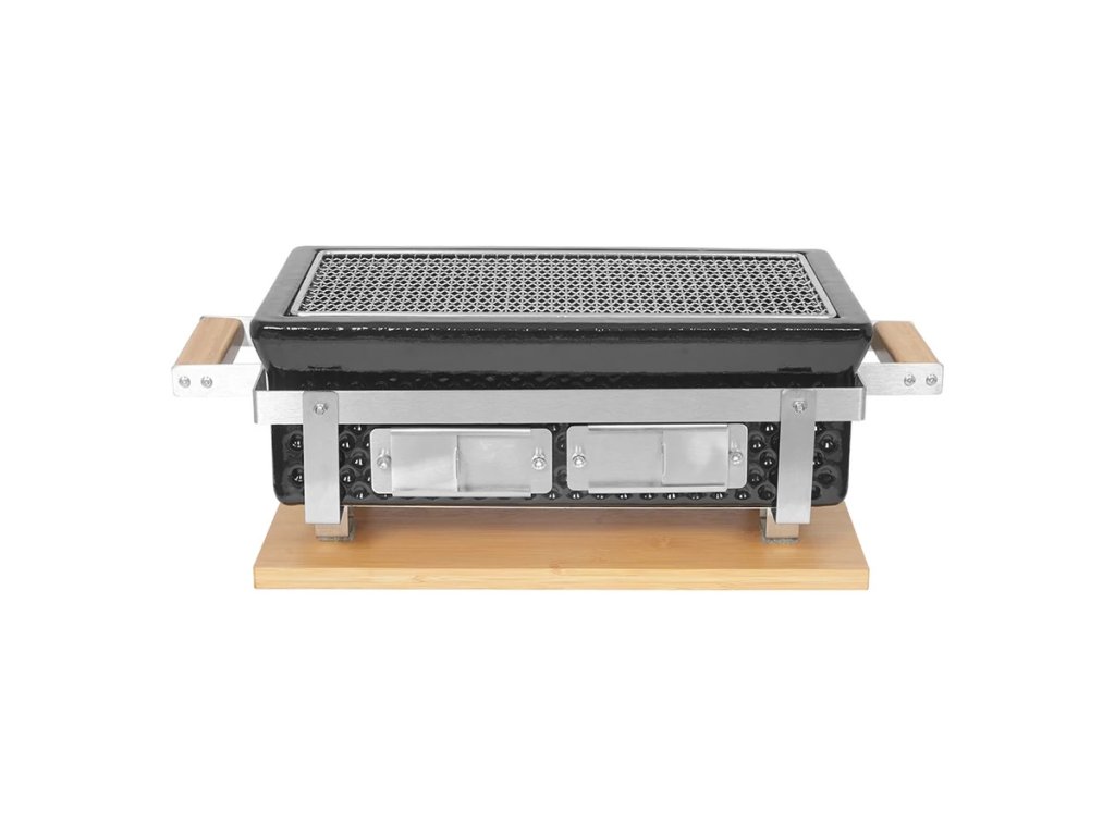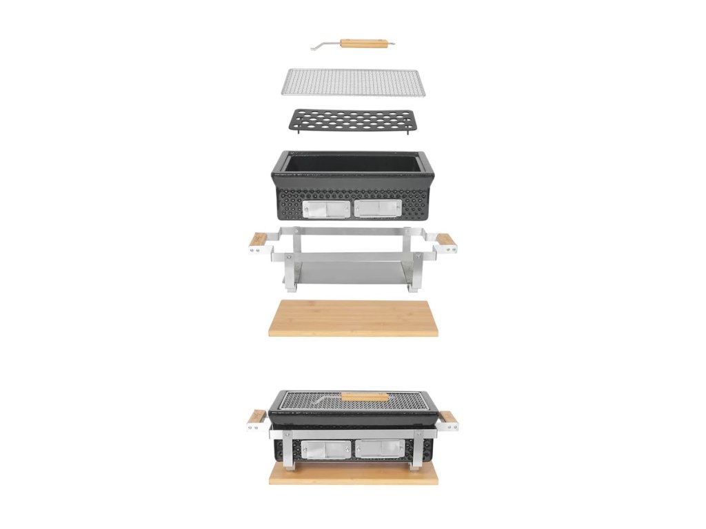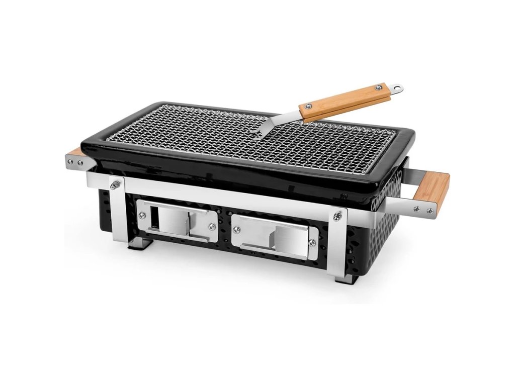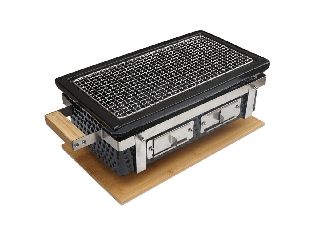 Popis: Kompaktní Hibachi gril navazuje na tisíciletou keramickou tradici. Masivní keramické tělo zajišťuje rovnoměrné rozvádění tepla, bambusové detaily přidávají přirozený vzhled a nerezová ocel poskytuje pevný a stabilní rám. Využijte ho pro přípravu šťavnatých steaků, zeleniny i mořských plodů.