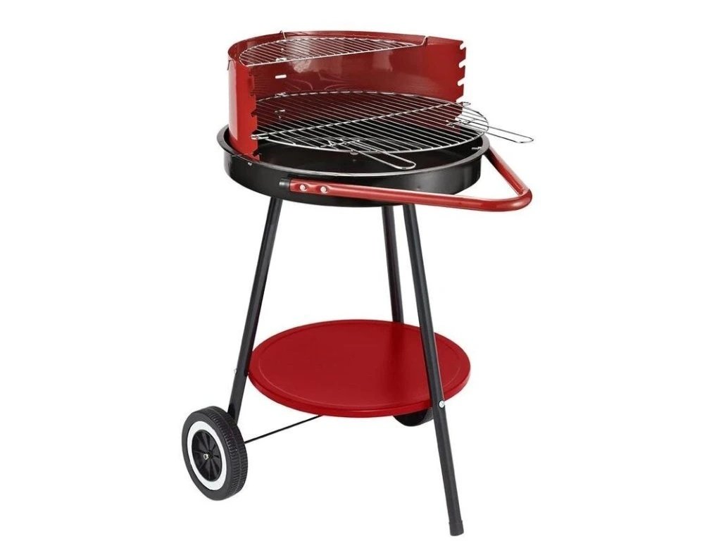 Kulatý zahradní gril s trojnožkou, policí a kolečky – emalovaná ocel, chromovaný rošt Klasická konstrukce pro grilování na dřevěném uhlí, výška roštu rychle nastavitelná Snadné přemístění díky kolečkům, spodní polička pro odložení náčiní či potravin