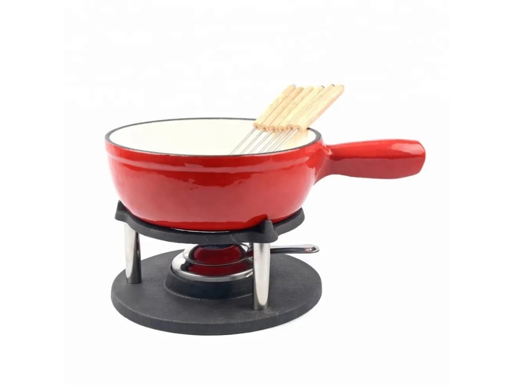 Fondue sada litinová 1,8 l se stojanem, hořákem a 6 vidličkami Hrnec vhodný na všechny typy sporáků a do trouby do 300 °C Ideální pro sýr, čokoládu i masové fondue
