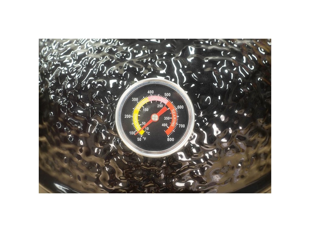 Prémiový keramický Kamado gril s leskle černým povrchem a bohatým příslušenstvím. Nabízí autentickou chuť dřeva, perfektní tepelnou izolaci a možnost grilování, pečení i uzení až 12 hodin bez doplňování uhlí.