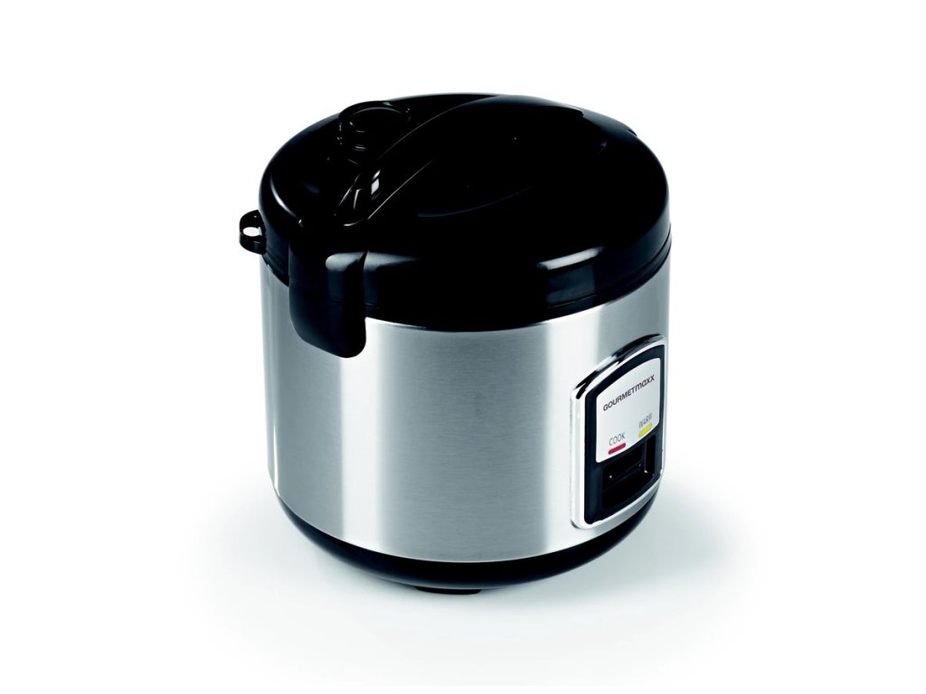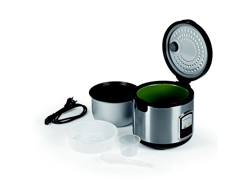 Automatický rýžovar 2,2l s párou – nerezové provedení se silikonovým těsněním Dvojitá stěna s „cool touch“ povrchem, odnímatelný vnitřní hrnec s nepřilnavou úpravou Funkce vaření rýže, páry i „keep warm“, 400W výkon, 45W udržování teploty, až 5 šálků rýže