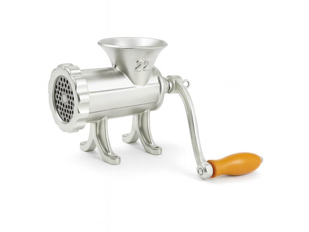 Ruční masomlýnek z litiny s dřevěnou rukojetí – robustní stolní provedení Šroubový mechanismus připevnitelný čtyřmi šrouby ke stolu Kompletní sada dílů pro spolehlivé mletí masa i zeleniny