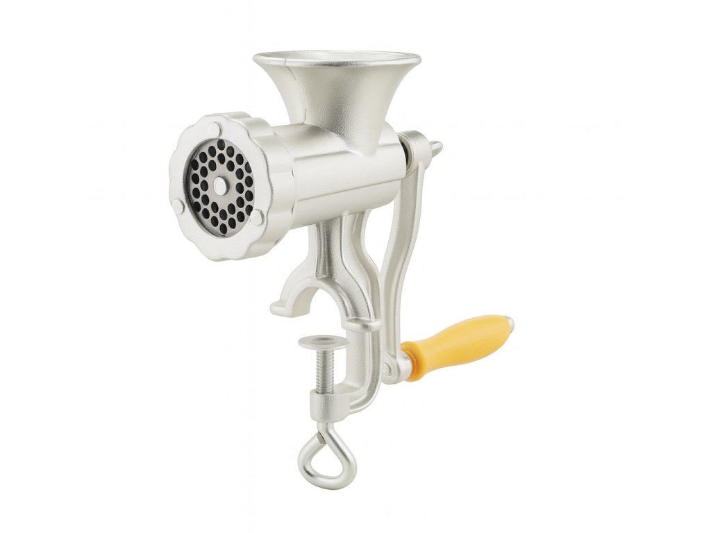 Ruční masomlýnek z litiny s dřevěnou rukojetí – stolní provedení se šroubovým uchycením Masivní litinový rám, připevnitelný ke stolu šroubem pro stabilní mletí Kompletní sada dílů pro spolehlivé mletí masa a potravin