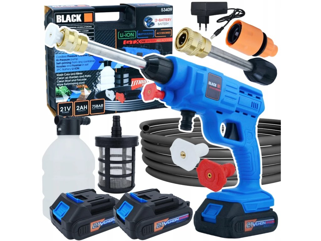 Aku vysokotlaký čistič 75BAR 21V s výkonem 800W, 2x 2Ah bateriemi a samonasávacím systémem Ideální pro čištění aut, teras a bazénů.