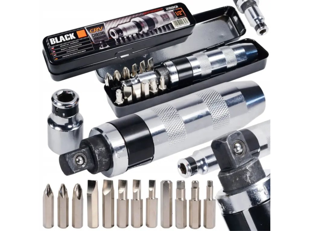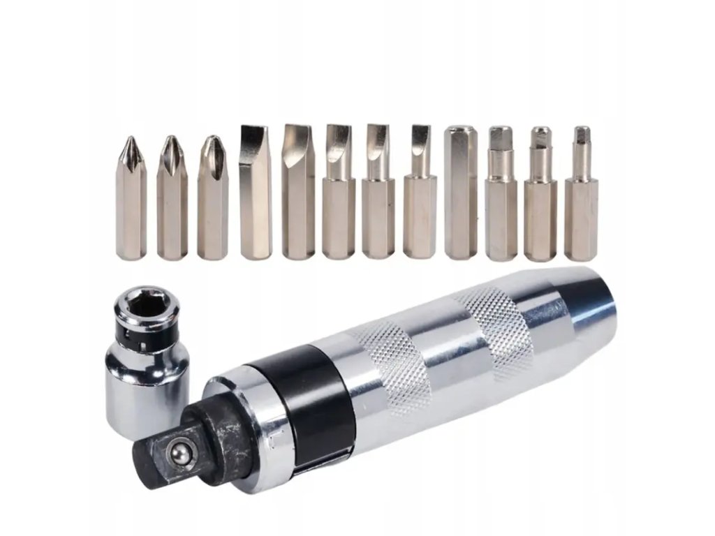 Sada rázového šroubováku s kvalitními bity je ideální pro rychlé odstranění zaseknutých, zrezivělých šroubů, s automatickým otáčením o 90° po nárazu a odolnou Cr-V ocelí.