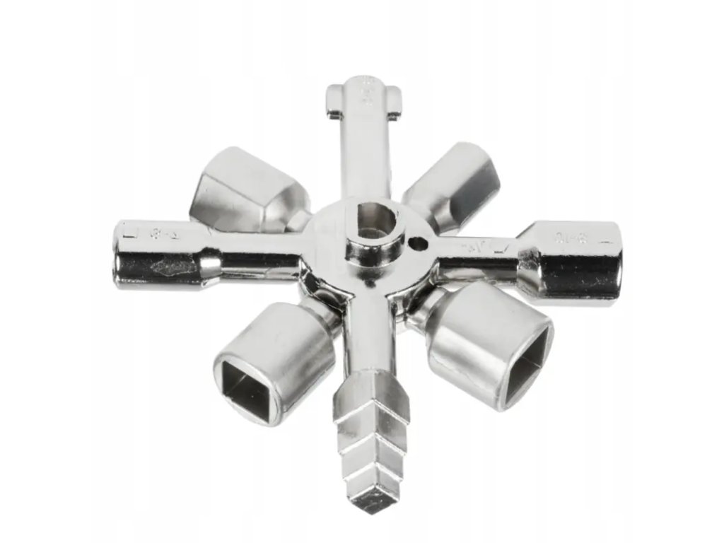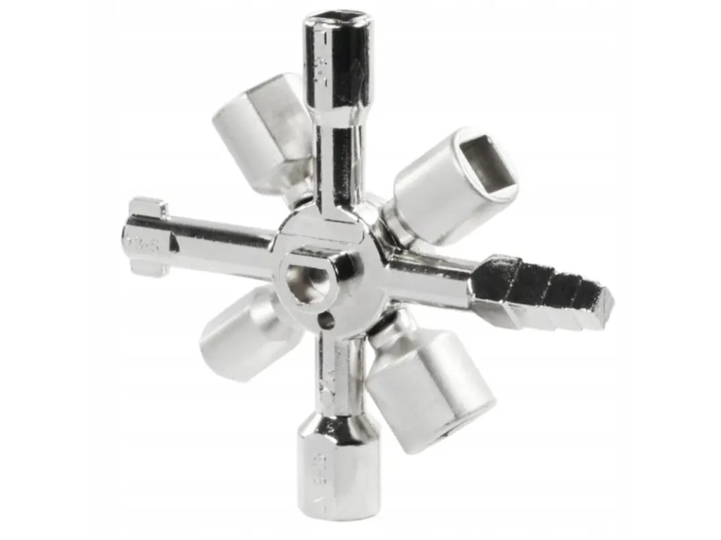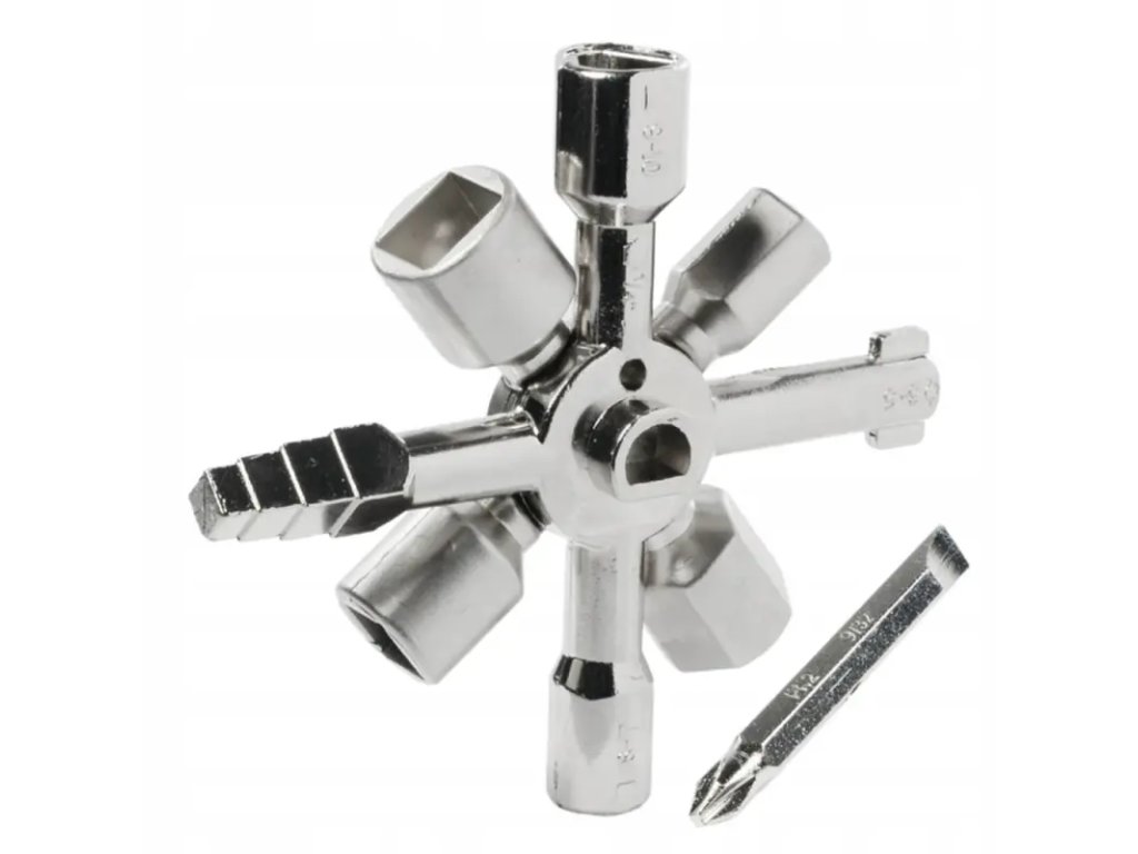 Multifunkční univerzální klíč 10v1 pro bezpečnostní a rozváděcí skříňky. Odolná ocelová konstrukce a kompaktní design umožňují snadné přenášení a široké využití.