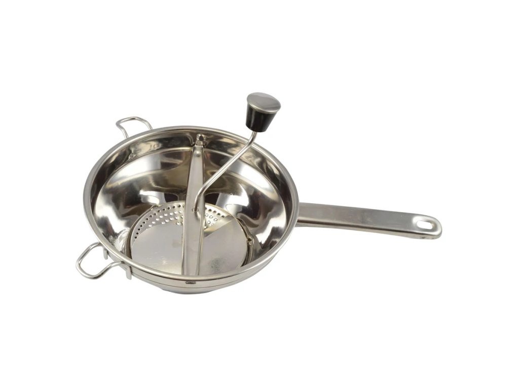 Praktický ruční pasírovač z nerezové oceli se třemi síty různých velikostí. Ideální pro pasírování rajčat, ovoce, zeleniny i ryb – snadné čištění a dlouhá životnost.