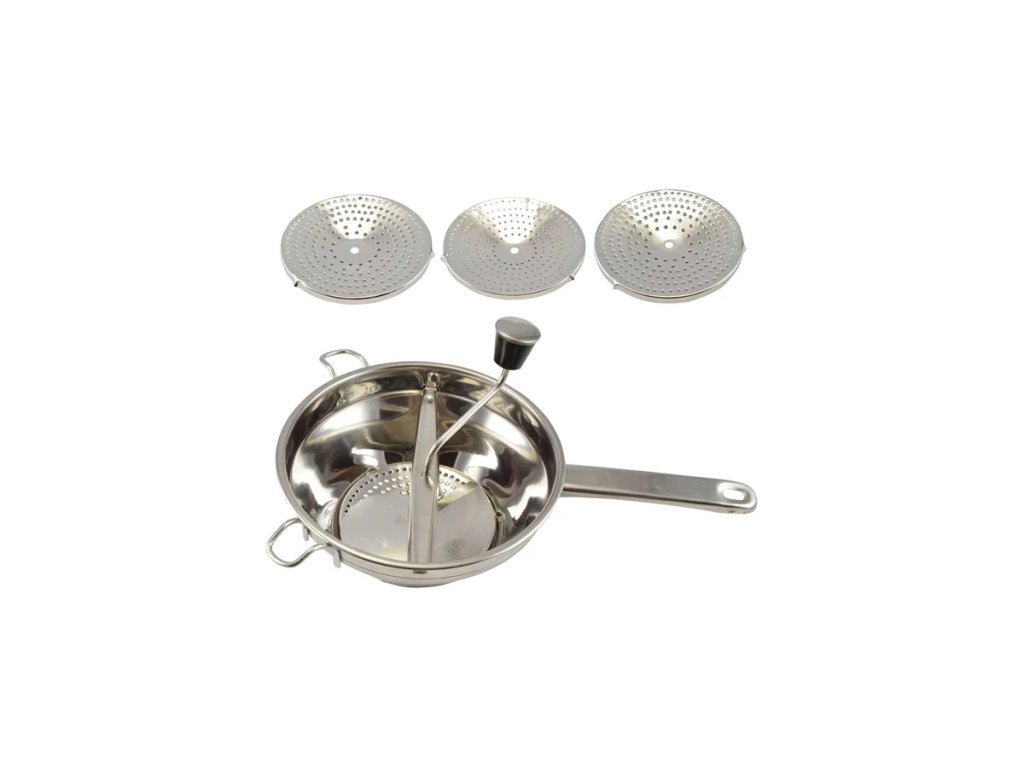 Pasírovač omáček s vyměnitelnými sítky Průměr 19 cm, délka 34 cm – ideální pro rajčatové omáčky, zeleninu i rybí vývary Kvalitní nerezová ocel a plast, sada 3 různých sítkových vložek pro univerzální použití