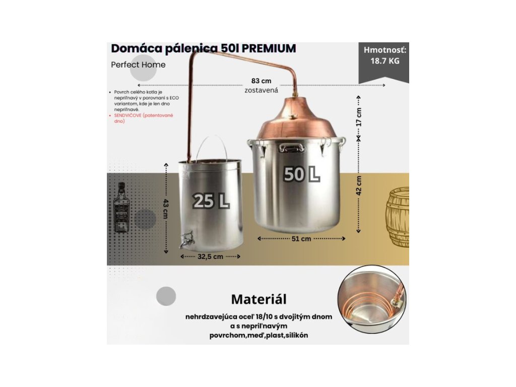Domácí certifikovaná palírna 50L PREMIUM je vyrobena z nerezavějící oceli s nepřilnavým matným povrchem, měděnou kupolí i měděnou spirálou chlazení. Povrch celého kotle je nepřilnavý v porovnání s ECO variantou, kde je jen dno nepřilnavé. Upozornění: rozdíl mezi ECO a PREMIUM variantou je poměrně snadno viditelný a to matnými bočními stranami varného kotle u PREMIUM varianty jako i v samotné váze cca o 3kg těžší oproti ECO kde jsou boční lesy. Chladič je vyroben z nerezového materiálu o tloušťce 1mm a je vybaven napouštěcím regulačním ventilem pro přívod studené vody a propustným hrdlem na vrchu pro odvod ohřáté vody. Samozřejmostí je měděná spirála s výpustným hrdlem na spodku chladiče.