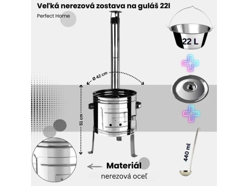 Velká 4v1 nerezová sada na guláš 42cm s kotlíkem 22l Perfect Home
